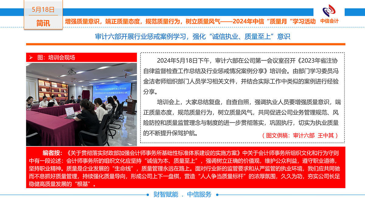 ——2024年中信“質(zhì)量月“學習活動。審計六部開展行業(yè)懲戒案例學習,強化“誠信執(zhí)業(yè)、質(zhì)量至上”意識 -