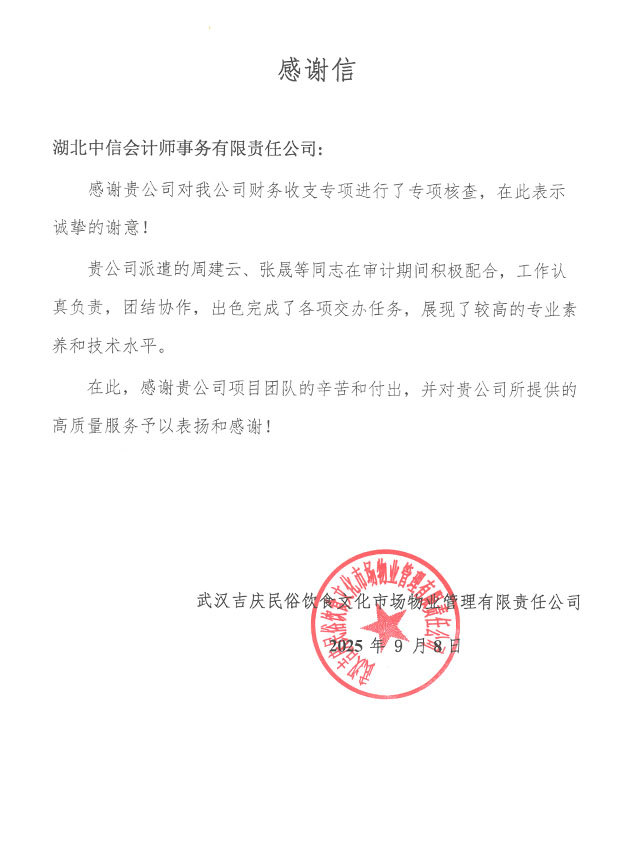 武漢吉慶民俗飲食文化市場(chǎng)物業(yè)管理有限責(zé)任公司感謝信
