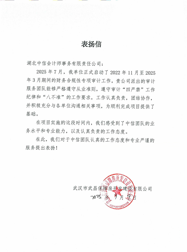 武漢市武昌保障房開發(fā)建設(shè)有限公司表?yè)P(yáng)信