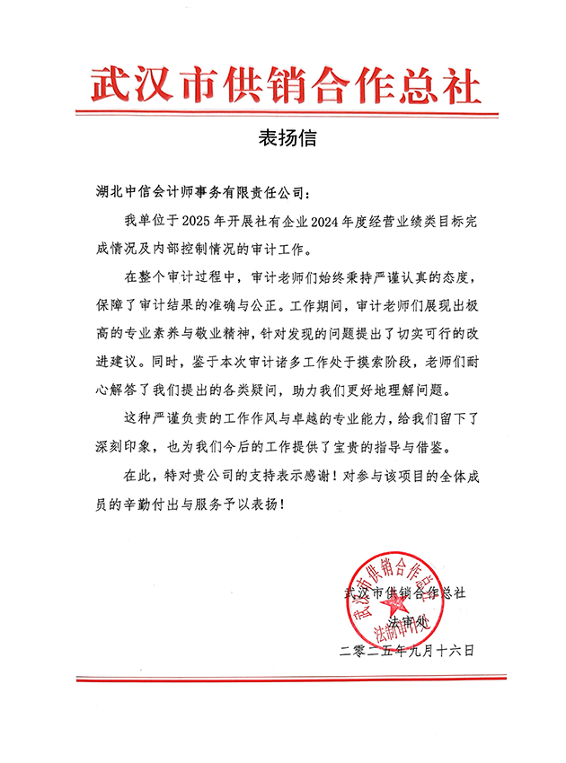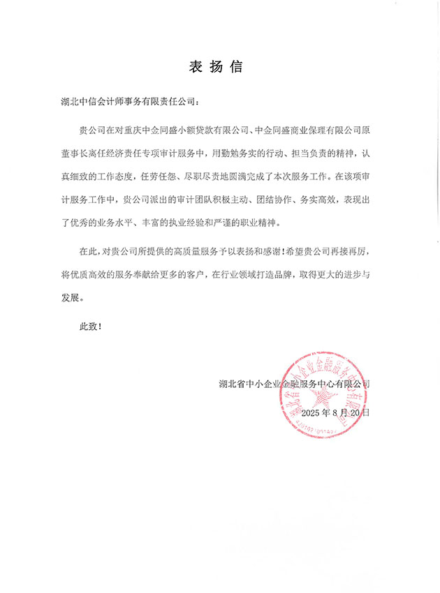 湖北省中小企業(yè)金融服務(wù)中心有限公司表?yè)P(yáng)信