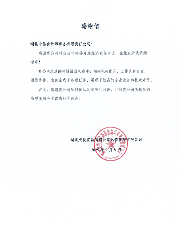 湖北交投宜昌高速公路運(yùn)營(yíng)管理有限公司感謝信