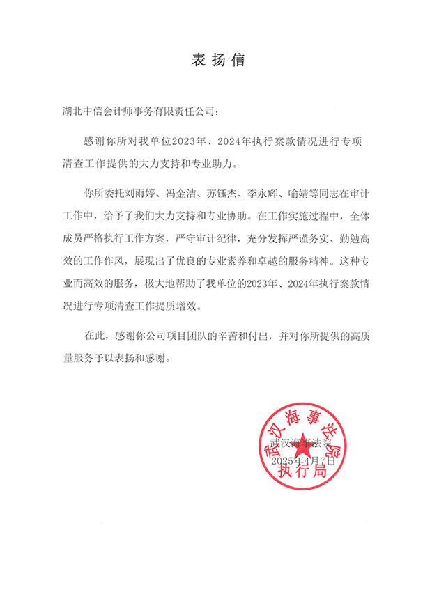 武漢海事法院表?yè)P(yáng)信