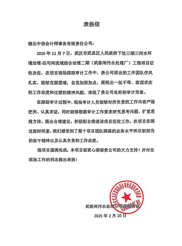 武泰閘污水處理廠項(xiàng)目指揮部表?yè)P(yáng)信