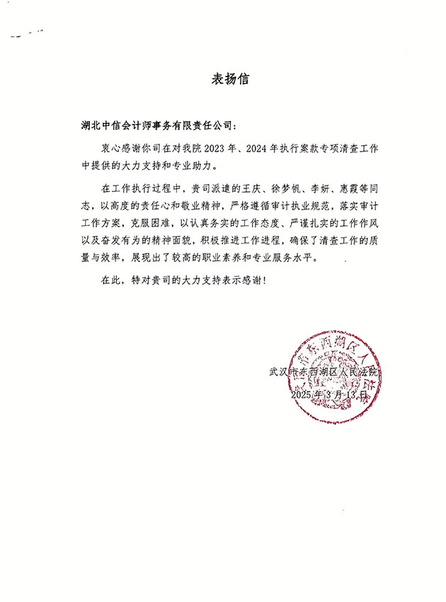 武漢市東西湖區(qū)人民法院表?yè)P(yáng)信