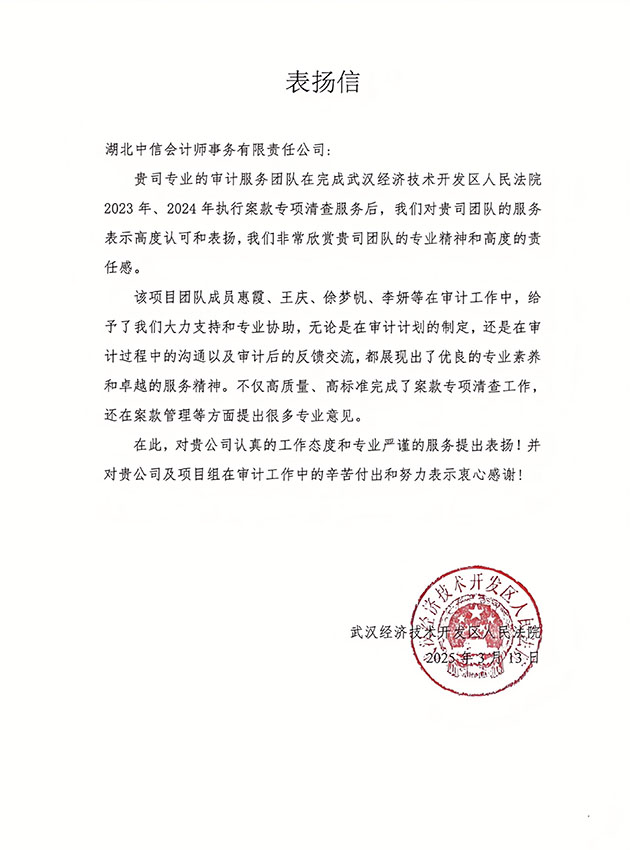 武漢經(jīng)濟(jì)技術(shù)開(kāi)發(fā)區(qū)人民法院表?yè)P(yáng)信