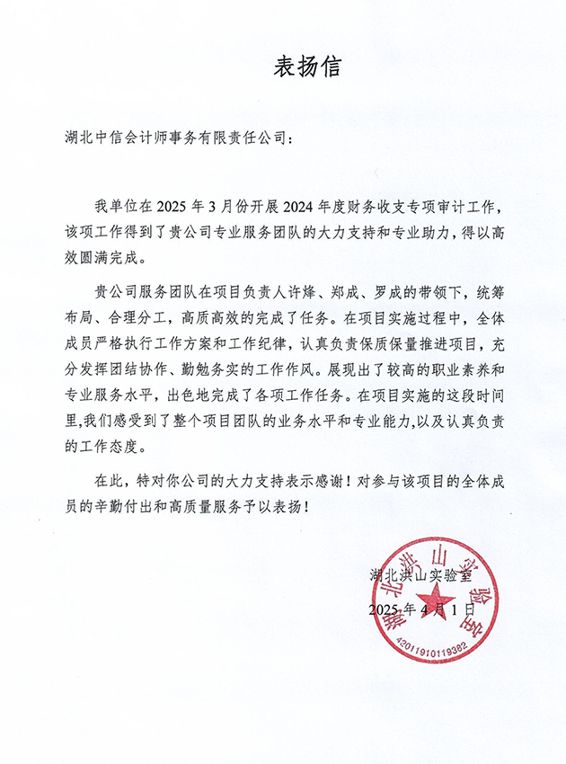 湖北洪山實(shí)驗(yàn)室表?yè)P(yáng)信