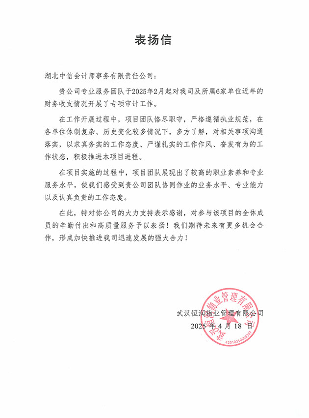 武漢恒潤(rùn)物業(yè)管理有限公司表?yè)P(yáng)信
