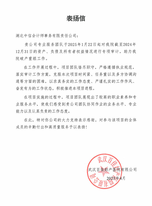 武漢百佳婦產(chǎn)醫(yī)院有限公司表?yè)P(yáng)信
