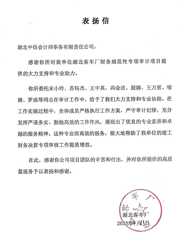湖北客車廠表?yè)P(yáng)信