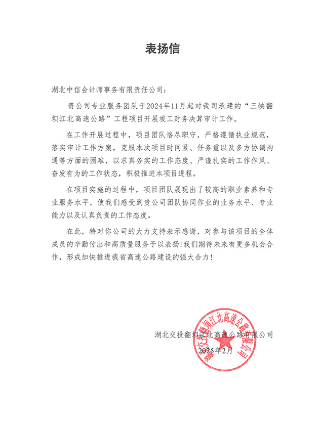 湖北交投翻壩江北高速公路有限公司表?yè)P(yáng)信