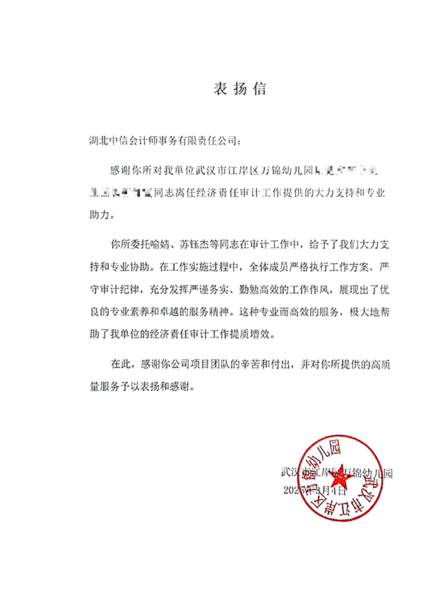 武漢市江岸區(qū)萬錦幼兒園表?yè)P(yáng)信