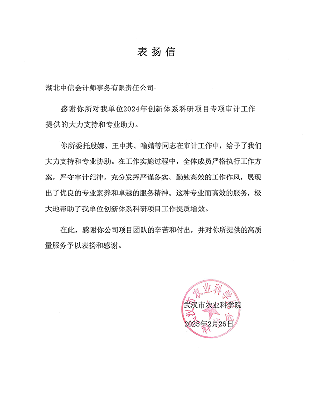 武漢市農(nóng)業(yè)科學(xué)院表?yè)P(yáng)信