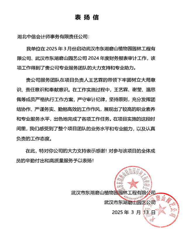東湖磨山植物園園林工程有限公司表?yè)P(yáng)信