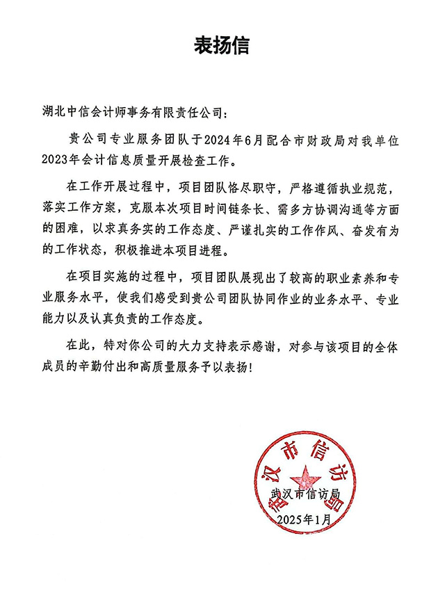 武漢城市發(fā)展投資有限公司審計(jì)法務(wù)部表?yè)P(yáng)信